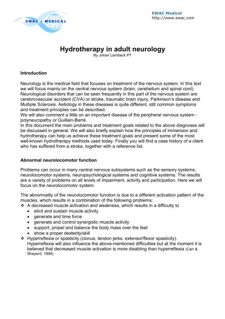 Halliwick Aquatic Therapy has mainly used in neurorehabilitation and pediatrics. All of the above benefits are simply not possible with land exercise. Tripp and Krakow 2012 applied WST on a.
